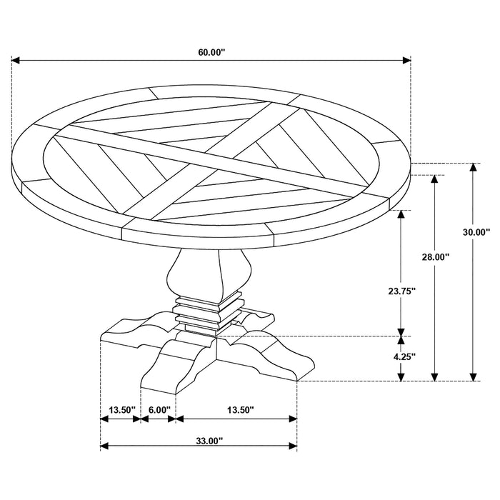 Inspired by 18th and 19th-century European design, this French country-style dining table blends timeless elegance with rustic charm. Crafted from solid pine, it features a round top with an intricate inlaid veneer pattern that enhances its refined character. The bold pedestal base, with sculpted detailing and curved feet, evokes the craftsmanship of traditional farmhouse and Colonial-era furniture. A weathered finish completes the look, making this table a warm and inviting centerpiece for any dining space.