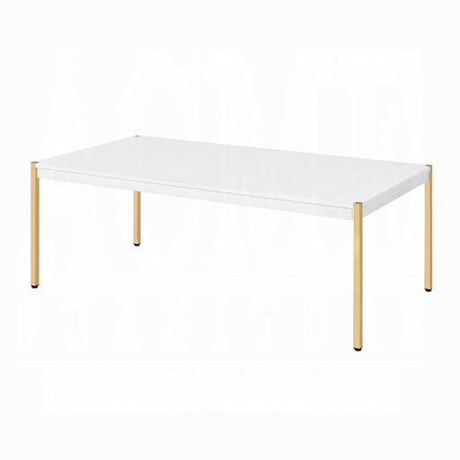 A spacious white high-gloss tabletop defines the modern appeal of this rectangular coffee table. The thick square-edged surface rests within a sled...